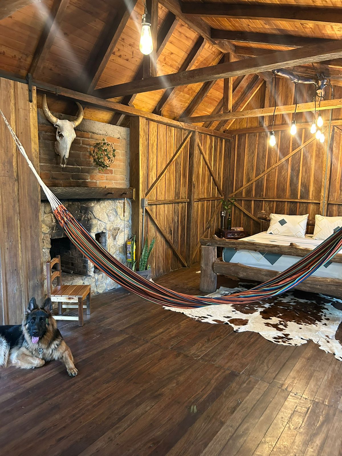 Concepto farmhouse, construcción en madera dentro de un bosque nativo, cama queen, baño privado, chimenea, hamaca interior, cocina+minibar, terraza,jacuzzi+calentador.
